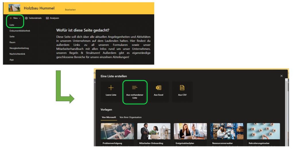 Die Liste können Sie auf einer bestehenden SharePoint-Seite ganz einfach einbinden, indem Sie oben Links unter „Neu“ den Punkt „Liste“ auswählen und im darauffolgenden Menü den Punkt „aus vorhandener Liste“ auswählen.