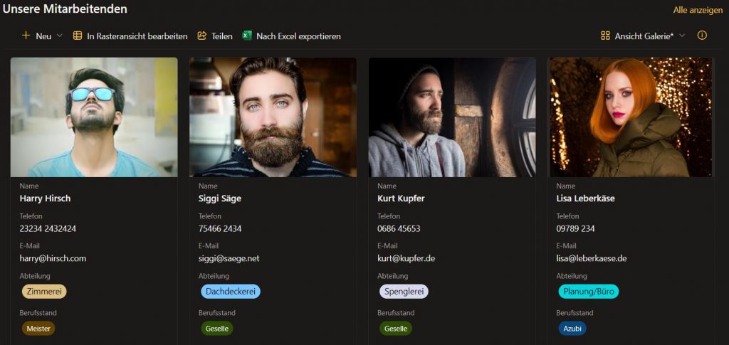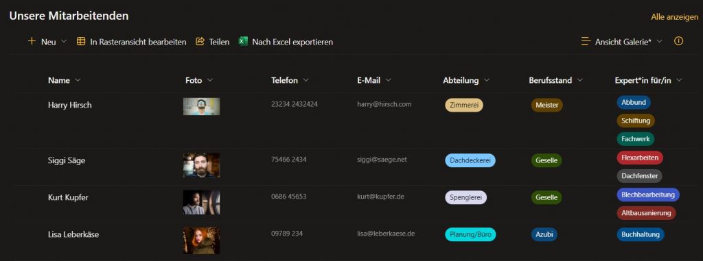 Standardmäßig wird die Liste auch als Listenansicht auf der Seite dargestellt. Dies können Sie jedoch anpassen, wenn Sie möchten. Am folgenden Beispiel wurde die Ansicht „Galerie“ verwendet, um die Profilbilder der Mitarbeitenden noch etwas „prominenter“ darzustellen: